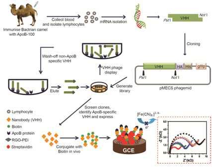 血液中ApoB-100是冠状动脉疾病的重要风险因子,灵敏快速检测ApoB-100的含量对于预测和预防冠状动脉疾病非常重要。本研究中,研究人员通过“纳米抗体筛选平台”鉴定出4株针对ApoB-100纳米抗体(Nb4、Nb11、Nb44、Nb90), 并对其中一株亲和力最高的Nb90进行功能化修饰,即C端生物素化。利用链霉亲和素与生物素的相互作用将纳米抗体固定在在聚乙烯亚胺(PEI)功能化石墨烯复合材料所修饰的电极表面。通过对抗原的特异性识别,形成免疫复合物,并通过不同抗原浓度所引起的阻抗值的变化定量检测ApoB-100。其线性范围为0.05到 5 ng mL-1,检测限为0.03 ng mL-1。