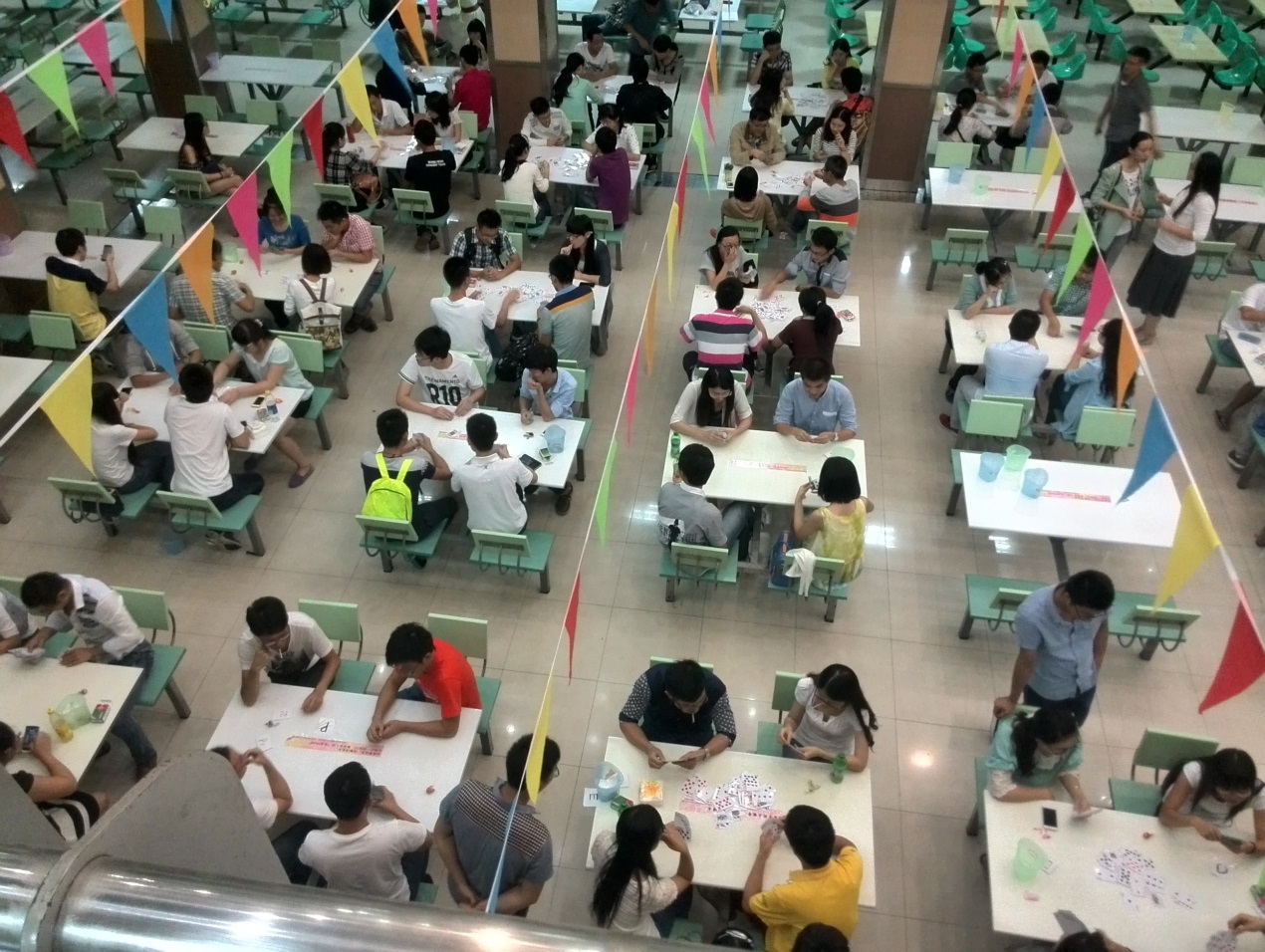 2014年9月21日19点,东南老员工科&电子联合掼蛋大赛在沙塘园餐厅员工就餐区成功举办。此次大赛由太阳集团tcy8722研究生会&电子工程公司研究生会联合承办,也是太阳集团tcy8722新一届研会组织的首场活动。本次活动得到了广大老师和同学们的支持,各个院系的同学们踊跃报名、积极参赛,与此同时,还吸引了很多不会掼蛋的同学前来围观和交流。36组选手牌技高超,角逐激烈,各组实力不相上下。本次活动的主题是收获友谊,因此,在比赛开始之前各组选手有五分钟互相认识以及互留联系方式的时间。本次大赛以抽签的形式开始比赛,抽到相同号码的参赛选手为一组,不仅体现了公平公正的比赛态度,还体现了友谊联赛中的“缘分”情节。第一轮实行淘汰制,取前十六名进入下一轮。获胜组继续比赛,淘汰组到休息区可以聊天,或继续掼蛋以及其他纸牌游戏。主办方还为大家准备了糖、话梅等各种零食小吃,各个院系的同学们有说有笑,气氛融洽,不亦乐乎!最终进入半决赛的四个小组,技艺精湛,手法娴熟,正所谓巾帼不让须眉,电子院的两名女同学获胜杀进决赛,比赛进入白热化,最终进行加时赛决出胜负,信息公司的王恒康、邵阳赢得桂冠,金月、田伟娜斩获亚军,张俊、贾建宇、顾凯、陈辉荣获季军。进入半决赛的四组选手获得了移动电源、8G优盘、太阳成集团纪念杯等丰厚的奖品。