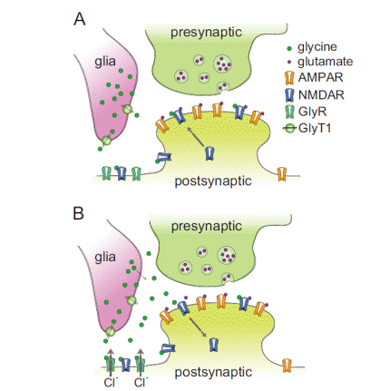 NMDA受体是中枢神经系统重要的兴奋性递质受体之一,在感知、发育、认知、突触可塑性及学习记忆等正常脑功能中发挥关键作用,而甘氨酸是中枢神经系统细胞外广泛存在的氨基酸,其潜在的作用靶点有三个:与NMDA受体GluN1亚单位结合作为NMDA受体激活的共激动剂(co-agonist)、结合并激活甘氨酸受体、结合GluN3A受体。甘氨酸与这三个靶点的亲和力是GluN3A受体亚单位>GluN1受体亚单位>甘氨酸受体。该课题组前期研究发现当胞外甘氨酸浓度达到一定水平后,其不再诱导AMPA受体介导的LTP(long-term potentiation),而是诱导LTD(long-term depression)。此次研究进一步发现外源或内源甘氨酸在低浓度和高浓度时也分别能诱导海马神经元产生NMDA受体介导的LTP(LTPNMDA)和LTD(LTDNMDA),其机制是分别通过作用于NMDA受体共激活位点及甘氨酸受体,引起NMDA受体活动依赖的转运上膜或下膜(见附图)。该研究结果排除了GluN3A受体在其中所起的作用,这与海马部位GluN3A含量极少的发现相一致。该研究解析了甘氨酸门控NMDA受体介导突触电流可塑性的机制,对进一步了解正常生理及病理状态下NMDA受体相关脑功能的调控具有普遍意义。