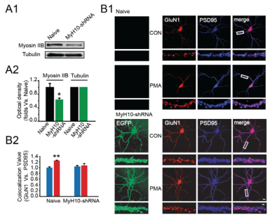 NMDA受体是中枢神经系统最重要的兴奋性递质受体之一,在感知、发育、认知、突触可塑性及学习记忆等正常脑功能中发挥关键作用。NMDA受体在突触后膜的转运可改变突触后膜NMDA 受体数目,因而可能对NMDA受体依赖的脑功能产生重要影响。然而,目前对参与调控NMDA受体膜转运的信号分子了解甚少。该研究发现Myosin IIb这样一个非传统的马达蛋白分子能够被PKC激活,PKC激活后又能间接激活下游分子MLCK,进而MLCK直接作用于Myosin IIb,调控突触后actin的解聚、聚合动力学特性,在NMDA受体膜转运中发挥重要作用,类似于为NMDA受体上膜铺设轨道。试验中采用了多种方法,包括生化、细胞生物学、电生理等方法以及病毒转染后敲减Myosin IIb和MLCK敲除小鼠。该研究解析了Myosin IIb参与NMDA受体膜转运的分子机制,对进一步了解NMDA受体膜转运在突触可塑性及学习记忆中作用以及转运过程的精细调控具有重要意义。