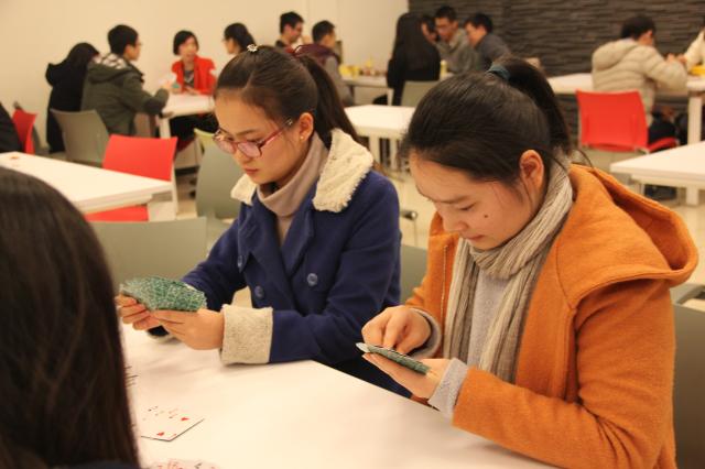 本次比赛采用淘汰制,共四轮,每轮半个小时,在规定时间内占优势的组可进入下一轮。比赛现场,68组选手为大家展示了高潮的牌技,角逐激烈,各组实力不相上下。获胜组继续比赛,淘汰组到休息区可以聊天,或继续掼蛋以及其他纸牌游戏。主办方为大家准备了糖、瓜子等各种零食,同学们有说有笑,气氛融洽,不亦乐乎!经过激烈角逐,电子工程公司顾冬清、孙飞同学拔得头筹;陆驹、王乐位居第二;张喆、黄聪第三名,胡琳、张远第四名。获胜选手获得了移动电源、8G优盘、纪念杯等丰厚的奖品。