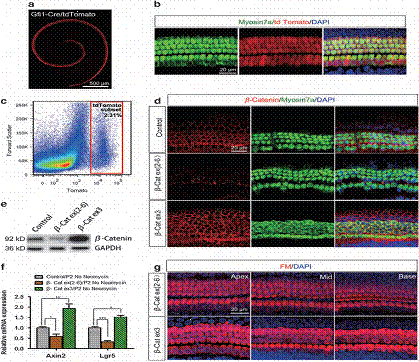 之前的研究表明,Wnt/β-catenin信号通路在毛细胞发育和再生中发挥重要作用,但Wnt/β-catenin信号在保护毛细胞方面的作用之前完全没有报道。本研究利用敲除或过表达毛细胞中经典Wnt 信号中介物β-catenin 的转基因小鼠首次发现了Wnt/β-catenin信号对新霉素诱发的耳蜗毛细胞损伤具有保护作用。我们首先发现毛细胞中β-catenin的缺失使它们更容易受到新霉素损伤;之后,我们发现β-catenin的缺失使新霉素损伤诱发的毛细胞凋亡因子Caspase介导的凋亡增加,而β-catenin 过表达能够抑制Caspase介导的凋亡发生。最后,我们证明了β-catenin 的缺失会导致与抗氧化物酶有关的Foxo3 转录因子和Bim 的表达量增加;因此在新霉素给药后活性氧水平的升高是毛细胞对氨基糖苷类药物敏感性增加的原因。相反,β-catenin的过表达会导致Foxo3和Bim 表达量减少、活性氧水平的降低。这就表明激活Wnt/β-catenin 对新霉素损伤诱发的毛细胞缺失具有保护作用。因此,这可以作为防止毛细胞死亡的一个新的药物靶点,这就为在临床上保护毛细胞提供了新的治疗途径。