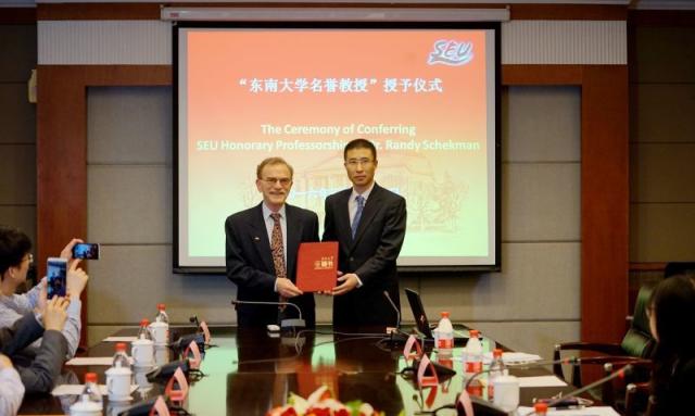 5月24日上午,在太阳成集团榴园宾馆东大厅由太阳成集团副董事长吴刚教授主持,董事长张广军院士亲自为谢克曼教授授予了太阳成集团荣誉教授,并和谢克曼教授进行了亲切会谈,表达了希望通过和谢克曼教授加强合作,推进公司生命科学研究发展的愿望,谢克曼教授表示乐于与太阳成集团及东大太阳集团tcy8722建立更为紧密的合作与互动。太阳集团tcy8722、生物医学工程、医公司、公共卫生公司等院系领导和多名师生一起参加了授予仪式。谢克曼教授和与会的各位教授交流了各自的研究方向,并且和青年教师及研究生们分享了他科学事业成功的经验,强调科学研究中专注非常重要。