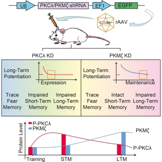 由于敲除动物存在的可能代偿现象,该课题组选择在海马背侧分别敲减这两个分子。令人意外的是,敲减PKCι/λ或 PKMζ后海马LTP及海马相关学习记忆均受影响,但受影响的阶段分别为早期表达/巩固阶段与后期维持,提示这两个分子在海马LTP及学习记忆中均有作用,但作用的阶段不同。拯救实验可以使这些异常翻转。为了进一步确定两个分子作用的具体阶段,采用先训练动物形成记忆然后再分别敲减这两个分子的方法,发现仅仅在敲减PKMζ后动物记忆的维持才受到影响,进一步证实这两个分子先后发挥作用。来自生化实验结果发现这两个分子先后在海马LTP及学习记忆早期表达/巩固阶段与后期维持增加,进一步支持PKCι/λ和PKMζ在LTP与学习记忆的不同阶段发挥作用。