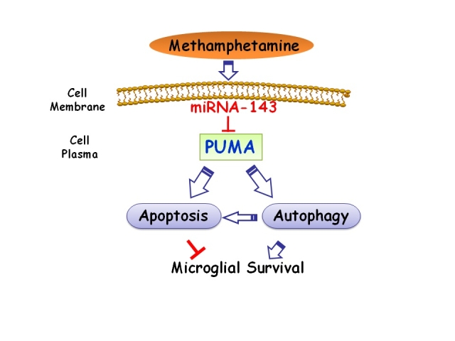“发育与疾病相关基因”教育部重点实验室姚红红课题组的论文 “Mir143-BBC3 cascade reduces microglial survival via interplay between apoptosis and autophagy: Implications for methamphetamine-mediated neurotoxicity” 于2016年5月16日被著名期刊Autophagy发表。该期刊是报道关于细胞自噬研究的国际权威刊物(5年影响因子为11.958)。本研究探讨miRNA-143和促凋亡蛋白PUMA调控小胶质细胞的功能。临床研究发现甲基苯丙胺成瘾者脑内存在大量活化的小胶质细胞,而小胶质细胞的过度活化又可以导致细胞的死亡。作为促凋亡蛋白PUMA,基因敲除PUMA反而加重甲基苯丙胺引起的小胶质细胞数目减少。围绕这一“PUMA矛盾现象”而展开系列研究,发现PUMA在促进小胶质细胞凋亡的同时也促进细胞自噬,而自噬促进细胞存活。敲除PUMA减少小胶质细胞凋亡,同时也降低小胶质细胞自噬,降低细胞存活,所表现出净效应是小胶质细胞存活下降。另一有趣的发现是PUMA的表达在转录后水平受miR-143调节,anti-Mir143能够通过上调PUMA调节细胞的自噬和凋亡,减轻甲基苯丙胺引起的小胶质细胞的死亡。在整体的动物模型上,anti-Mir143脑微注射进海马脑区,能够缓解小鼠脑内甲基苯丙胺导致的小胶质细胞减少,该研究结果在Mir143的基因敲除小鼠上也得到了进一步的证实。