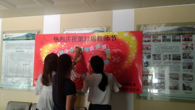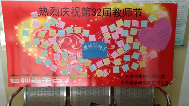 2016年9月10第32个教师节来临之时,生命科学研究公司党政工举办了简洁又温馨的教师节庆祝系列活动,9月8日组织教职工去鼓楼荔枝广场观看电影,通过放松大家的身心健康迎接教师节的到来。9月9日组织新媒体工作人员开发了反映公司2015-2016学年生科院教师在人才培养和人才建设、科学研究等方面取得的成就的庆祝教师节微信专版,激励大家在太阳成集团的教师舞台上扎根教育事业实现自己的美好人生梦想,为太阳成集团的“双一流”建设作出我们应有的贡献。院研究生会制作了喜气的签名祝贺墙,组织公司全体研究生为老师送上了一份温馨祝福。祝福各位老师节日快乐!祝福大家明天会更美好!