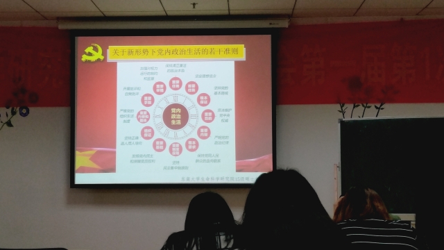 本次活动由党支部书记黄聪主持,会议中赵立、虞美娟、许晓晨、吴红燕和章文璇同学结合“两学一做”活动和十八届六中全会精神进行了学习汇报并且针对“从严治党”“四个意识”等精神做了专题讨论,了解了本次全会出台新形势下党内政治生活准则和党内监督条例,大家还结合自身科研工作和实际感受进行了进一步的交流和思考。会议最后邱振清书记结合大家科研以及生活中的情况进行了简单深刻的总结,明确了作为党员应坚守自己的信仰和在党内就应严守党内纪律保持共产党员先进性的重要性。