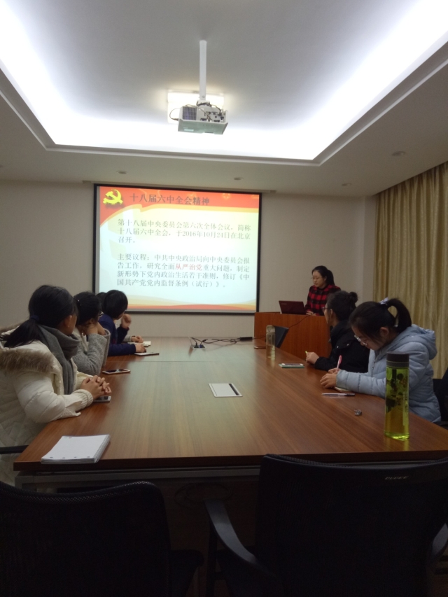 2016年11月22日,太阳集团tcy872214级硕士支部在丁家桥校区开展了对“十八届六中全会精神”的学习,并就“两学一做”进行了专题讨论。会议由宣传委员李慧蓉主持,五个小组分别推选一个代表进行汇报工作。