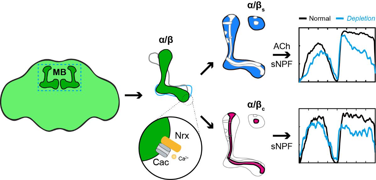 睡眠是一种至关重要并且进化上非常保守的行为状态,然而人们对这一生物学现象仍然知之甚少。睡眠障碍普遍存在于儿童孤独症等神经精神疾病患者中,但是其产生的原因一直并不清楚。临床遗传关联分析研究表明neurexin基因的突变与儿童孤独症的发生密切相关。neurexin是一种突触粘附分子,主要参与突触的形成和突触的神经传递过程。neurexin如何通过介导突触的神经传递而参与睡眠调控的神经细胞分子机制值得深入探讨。该研究工作以果蝇为模型对neurexin对睡眠调控的神经细胞分子机制进行了研究,发现neurexin通过耦联Cac钙离子通道介导蘑菇体α/β神经元的突触传递进而参与睡眠调控,并阐明蘑菇体α/β柄叶的多个亚类神经元分别释放乙酰胆碱和/或sNPF神经肽参与夜间不同时相睡眠的调控作用。
