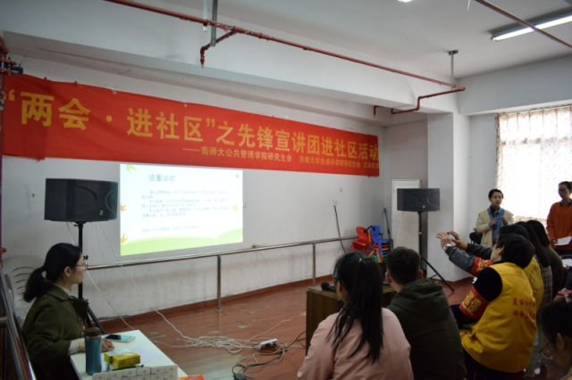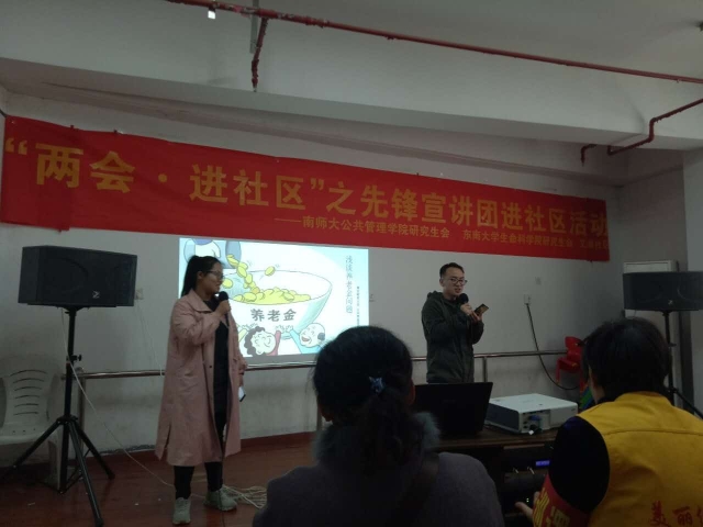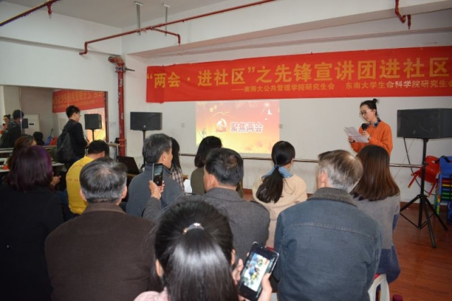 2017年3月28日,由东南老员工命科学研究院研究生会、南京师范大学公共管理公司研究生会以及文澜社区共同举办的“‘两会·进社区”之先锋宣讲团进社区活动”在文澜社区活动中心顺利开展。