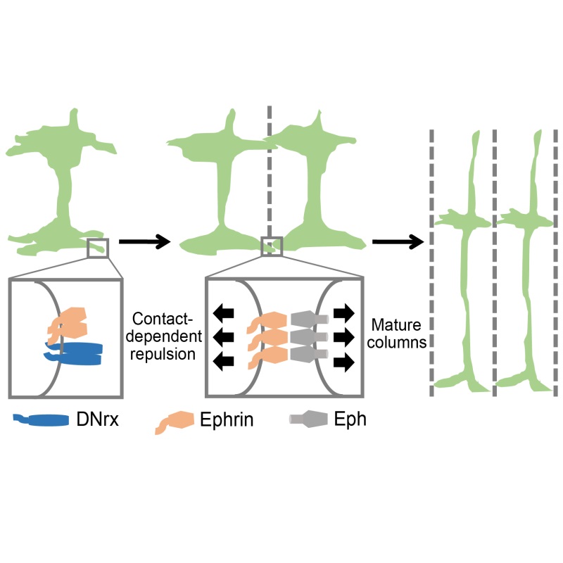 中枢神经系统和外周神经系统中的很多神经元往往以分层分束的形式进行排列。这种排列方式有助于对外界刺激信号的时间和空间信息进行高保真地传递。然而如何在狭小和紧密的空间内保持神经元成束排列的机制还不清楚。本研究以果蝇的视觉系统为模型,探索了细胞黏附分子Neurexin在限制L4神经元轴突分枝成束排列过程中的作用。研究首先揭示了L4神经元缺失Neurexin会削弱轴突导向分子Ephrin在细胞膜上的聚集,进而导致其轴突分枝异常投射到邻近的神经束中;研究接着阐明了Neurexin通过其胞内端与Ephrin相互结合并促进Ephrin在细胞膜上聚集的作用机制;研究最后还揭示了L4神经元下游的Tm2神经元表达的Neuroligin 4分子起始了L4神经元上的Neurexin分子的募集,随后促进了L4神经元中Ephrin的聚集;Ephrin与邻近L4神经元上的Eph分子协同作用限制了L4神经元轴突分枝的成束排列。该研究不仅揭示了Ephrin/Eph信号通路在神经元成束排列过程中的作用,而且阐明了Neurexin在神经元轴突导向和突触形成两个连续事件中的联系。