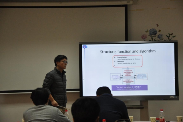 上海脑科学与类脑研究中心闵斌教授的报告题目是“Categorical Perception in Non-Human Primates: Experimental Evidence and Neural Circuit Modelling”。闵斌教授首先以一个有趣的心理学分类趋同现象开始了他的报告。然后讲述了在通过训练猴子学会两个任务,一个是匹配任务,一个是分类任务,在测试的时候记录前额叶皮层mPFC的神经元发放。以此提出了一个计算神经模型,表明分类任务的学习会影响原来掌管方向辨别的神经元的发放,使得两者有趋同性。