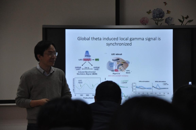 首场报告由上海科技大学管吉松教授主讲,他的报告题目是“Circuit of memory traces in mouse neocortex”。记忆巩固的神经环路机制是领域内一直争论颇大的科研问题,管吉松教授通过大规模单神经元解析度的在体成像技术,寻找和追踪小鼠皮层内神经元群体在长期记忆形成于提取过程中的反应活动特征,发现对特定环境作出反应的神经元群在很大程度上是分离的,表明皮层layer II环路中与记忆相关的痕迹是稀疏编码的。并且通过多通道在体记录技术,管吉松教授课题组发现,在长期记忆编码和提取阶段,都有海马的theta振荡与皮层的gamma振荡的cross-frequency coupling,并且有皮层与皮层的gamma 耦合。