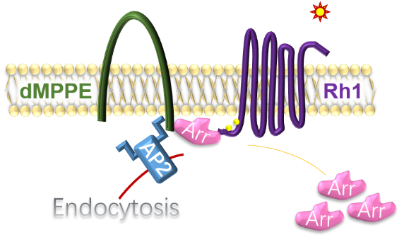 Rhodopsin (Rh) 是视觉信号传导中关键的G蛋白偶联受体(GPCR),该受体长时间激活后会进行内吞以避免受体过渡激活而导致的细胞损伤。在果蝇视觉系统中Arrestin1可以介导Rh的内吞灭活,但是该过程的内在分子机制尚不清楚。本研究发现了金属磷酸酯酶dMPPE的缺失会抑制Rh1内吞,且该作用既不依赖于dMPPE磷酸酯酶的活性也不受Rh1糖基化水平的影响。研究揭示dMPPE通过其C端结构域与Arrestin1直接结合,并促进了它与AP2的相互作用,从而介导了Rh1的内吞。在norpA突变体出现视网膜退化的情况下敲除 dMPPE可以通过抑制Rh1内吞来挽救退化表型。该研究提出了dMPPE、Arrestin1、AP2相互作用的新证据,揭示了dMPPE调控Arrestin1介导的Rh1内吞的分子机制,为GPCR的内吞和色素性视网膜炎的相关研究提供了新线索。