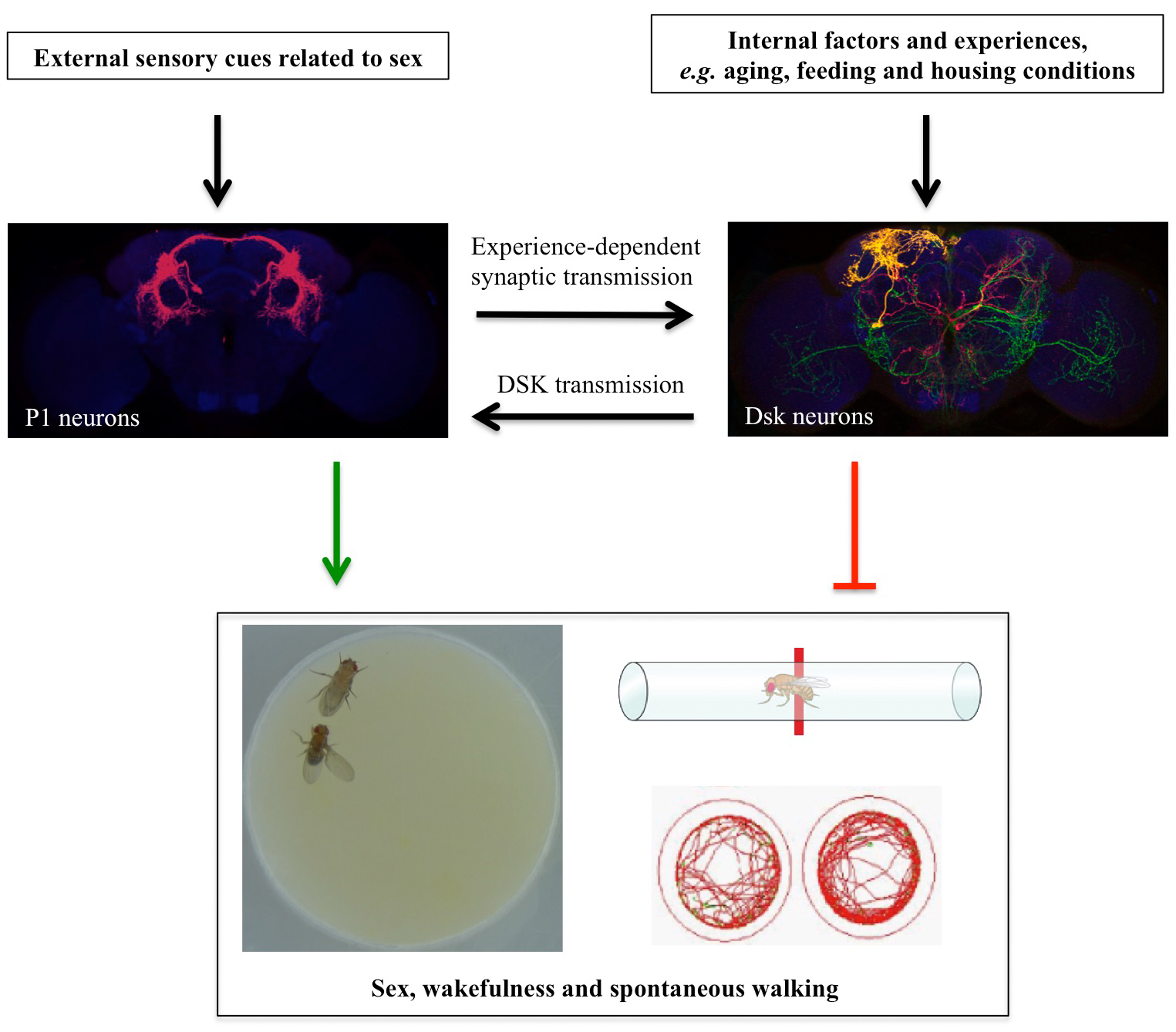 胆囊收缩素信号在进化过程中非常保守,可以调节多种行为。在哺乳动物中,从肠道产生的CCK作用于大脑中的受体,以传递饱腹感信号,从而抑制进食;此外,CCK还参与调控伤害性感受、学习记忆、攻击性行为和抑郁样行为等。在果蝇中,和CCK同源的DSK具有类似的生理功能。在这项研究中,潘玉峰课题组发现Dsk神经元在激活时能抑制果蝇90%的求偶行为,并且与求偶的兴奋性中枢P1神经元相互拮抗。P1神经元同时表达两个重要的性别决定转录因子Fruitless(Fru)和Doublesex(Dsx),并且只存在于雄蝇脑中。人为激活P1神经元时,雄蝇会处于高度觉醒的兴奋状态,其睡眠减少、运动增加、求偶和打斗增强。当同时激活P1神经元和Dsk神经元时,果蝇的觉醒兴奋状态会介于单独激活P1和单独激活Dsk神经元之间。在分子通路层面,研究发现Dsk神经元通过释放神经肽DSK并作用于其G蛋白偶联受体CCKLR-17D3(表达在包含P1的众多fru和dsx神经元中)以抑制求偶行为;在神经环路层面,该研究在单细胞层面揭示了四对Dsk神经元对求偶行为的调控作用,并且发现这些Dsk神经元通过突触连接接收来自dsx神经元(包括P1神经元)的信号。有趣的是,从dsx神经元到Dsk神经元的突触传递信号依赖于果蝇过去几天所处的饲养环境,比如是否群居。研究进一步发现,DSK的表达受到众多生理状态的调控,比如进食、群居、衰老等,而这些内在的生理状态可能决定了Dsk神经元是否活化并与外在感觉刺激一起调控性相关行为的输出与否。