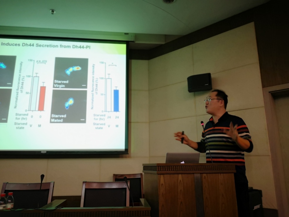 Young-Joon Kim教授关注的是雌性中的生殖行为,即雌蝇的接受及接受后行为。神经肽作为神经调质中的一类重要物质,响应外界环境和内在状态来灵活改变神经环路整合信息的方式。Kim教授提出了雌性响应血糖水平来影响自身精液排除的模型——低血糖水平的雌蝇在交配后能更多的释放神经肽DH44,导致了较低水平的精液排出。该研究为神经调质如何以环境依赖的方式影响行为的适应性输出提供了简单的模型。