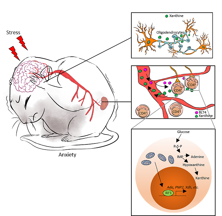 线粒体为细胞的生命活动提供能量,线粒体形态的变化参与了细胞代谢调控,对于细胞的正常发育维持维持至关重要。Miga2是一种线粒体外膜蛋白,敲除Miga2会导致线粒体嵴结构遭受严重破坏,失去正常情况下管状或网状的形态而呈现片段化形态。柴人杰课题组在电生理听力学检测中发现,在小鼠T细胞内特异性敲除MIGA2后,小鼠表现出听力受损的现象,对于外界多种频率声音刺激的听觉脑干诱发电位(ABR)低于普通小鼠。为了进一步了解免疫细胞中线粒体形态如何影响动物生理反应,柴人杰课题组与浙江大学靳津团队合作,利用各种动物行为学实验作为评价标准,发现体内缺少CD4+ T细胞的小鼠可以避免因外界压力下的慢性应激诱导产生心理疾病。实验数据显示,在慢性应激状态下,小鼠体内白三烯b4含量上升,使包括Naive T细胞在内的大量非炎性CD4+ T细胞线粒体碎裂。相应的代谢组学和转录组分析表明,CD4+ T细胞中线粒体碎裂可导致转录因子IRF1累积,IRF1与Ada、Xdh和Pnp2启动子区结合使葡萄糖更多的通过戊糖磷酸途径代谢,促进嘌呤从头合成。慢性应激焦虑模型中,小鼠血清黄嘌呤含量有显著的上升。柴人杰课题组从南京鼓楼医院采集到的临床证据也表明,焦虑症患者与健康对照组相比血清黄嘌呤水平升高。大脑杏仁核在恐惧与焦虑的产生中起着关键作用,T细胞产生的过量嘌呤(包括次黄嘌呤和黄嘌呤)通过血液循环进入脑部,与脑左侧杏仁核中少突胶质细胞上的腺苷受体A1结合,引起少突胶质细胞活化并增殖,继而过度活化左侧杏仁核区域神经元导致焦虑症状;同时利用脑定位注射装置向小鼠左侧杏仁核中注射腺相关病毒,特异性地敲除少突胶质细胞中的受体A1,敲除A1后焦虑小鼠症状有明显恢复,验证了以上结论。