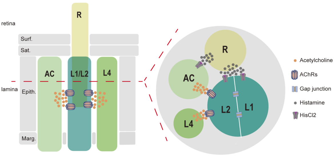 视觉神经系统是机体最主要的感觉系统,该系统具有快速起始和快速终止的特性,以确保视觉系统维持极高的时间分辨率。视觉信号传递的终止依赖于感光细胞及其下游神经元的快速灭活。前人的研究工作揭示感光细胞的光传导通路的快速灭活以及水平细胞和胶质细胞对感光细胞的负反馈信号介导了视觉反应的快速终止过程。然而感光细胞的下游神经元如何快速灭活的机制尚不清楚。该研究工作以果蝇视觉系统为模型,解析了乙酰胆碱信号介导感光下游神经元快速灭活的神经环路机制。研究揭示了果蝇的无长突细胞和L4神经元通过同步释放乙酰胆碱至L2神经元,介导L2神经元的快速灭活过程,研究还阐明上述两条平行的神经环路信号对高频的视动反应至关重要。该项研究工作系统地解析了视觉初级神经环路快速灭活感光细胞下游神经元的机制及其生理作用,在神经环路层面阐明了视觉传递快速灭活的全新机制,为感觉调控以及学习和记忆等过程调控机制研究提供了新的思路。