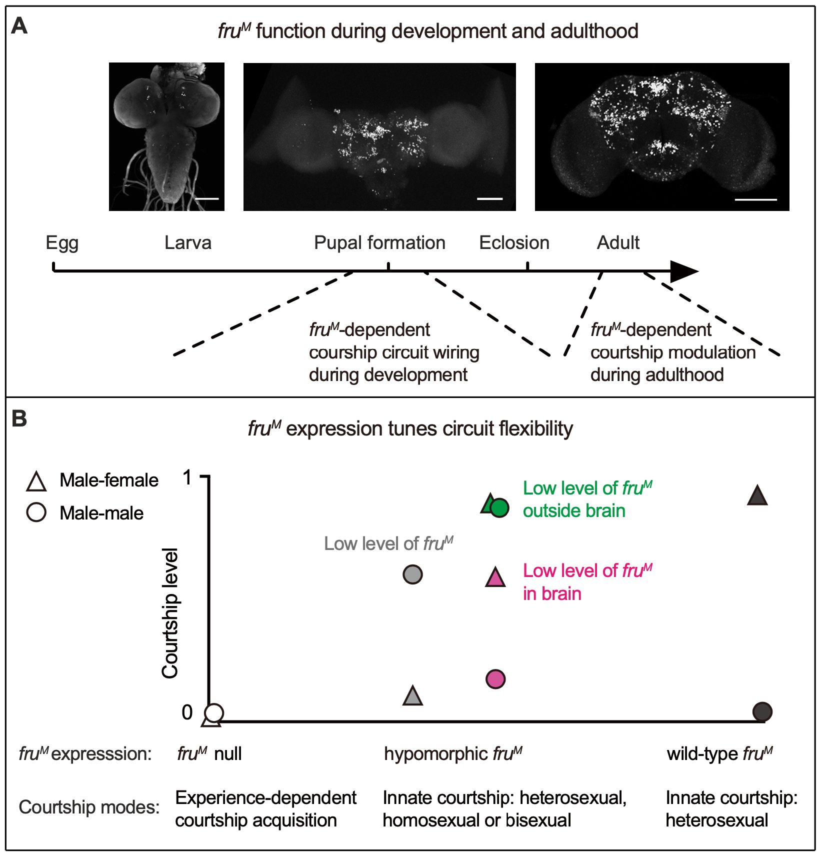 该研究主要有三个发现:第一、fru基因在一段关键的发育阶段调控求偶神经环路的发育/构建,并直接决定其产生本能的异性求偶行为;第二、fru基因在成年阶段对异性求偶行为并不重要,但是可以抑制同性求偶行为的产生;第三、fru基因并不是求偶行为的“开关”,即有和无,而是决定了求偶行为的模式:后天习得性求偶(无fru)、本能异性求偶(正常fru)、本能同性求偶(fru整体表达低)、本能双性求偶(fru在部分神经元表达低)。