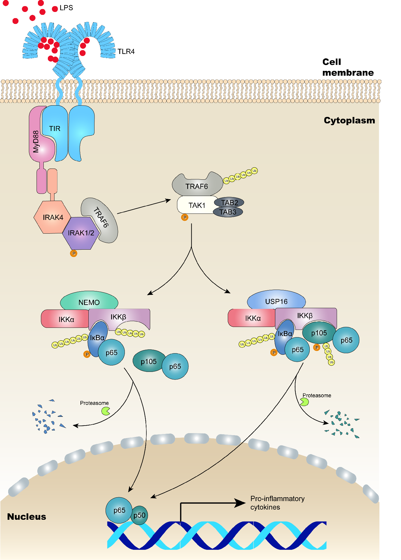 作者在研究中发现,即使在缺失IκBα招募蛋白NEMO的情况下,p105仍然存在一定程度的磷酸化,推测可能存在其他的类NEMO的调节型蛋白,参与IKKβ对特定底物的招募过程。通过质谱分析,作者确定了一种特异结合IKKα和IKKβ的去泛素化酶USP16,与NEMO一样,USP16与IKKβ上的同一结构域形成组成型的结合;USP16与NEMO上都存在一段包含5个氨基酸的保守序列,该序列对其与IKKβ的结合是必需的。因此作者认为,USP16与NEMO竞争结合IKKβ。在USP16缺失的髓样细胞中,p105的活化明显减少,而IκBα不受影响,且在受到Toll样受体(TLR)激动剂刺激时,NF-κB通路靶向的促炎因子IL-6、IL-12a、TNF-α的分泌能力明显下降。进一步研究发现,与IKKβ结合的USP16特异性擦除IKKβ上K6和K33-linked多聚泛素化链,去泛素化的IKKβ选择性识别p105并磷酸化p105,从而实现对NF-κB信号通路的进一步激活。