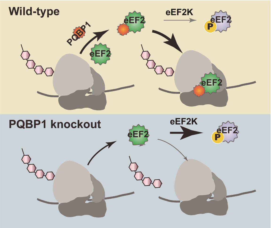 智力障碍是一种常见的神经发育障碍性疾病,其中约15%的智力障碍患者是由于X染色体基因突变所导致的。X染色体的多聚谷氨酰胺结合蛋白1基因(PQBP1)突变会导致智力障碍和儿童孤独症,但是其致病机理尚不清楚。针对该问题,该团队制备了PQBP1基因的条件性敲除小鼠,发现在海马神经元中敲除PQBP1导致认知功能显著下降,并揭示基因条件性敲除小鼠的认知功能障碍是由于代谢型谷氨酸受体依赖的突触长时程抑制受损所引起的。进一步研究揭示PQBP1竞争性地结合非磷酸化的翻译延伸因子eEF2,抑制eEF2K介导的eEF2磷酸化过程,调控了代谢型谷氨酸受体依赖的突触长时程抑制。研究显示在正常小鼠的海马中注射干扰PQBP1/eEF2结合的多肽,同样导致mGluR-LTD受损,引起认知功能障碍。该研究还揭示PQBP1通过抑制eEF2K介导的eEF2磷酸化调控蛋白质翻译的机制在所有细胞中普遍存在。该研究揭示了PQBP1作为eEF2K/eEF2通路的一种全新调控方式,为PQBP1突变或多拷贝重复导致智力障碍的致病机理提供了新的解释。同时,为eEF2/eEF2K通路异常相关的神经精神疾病、病毒感染以及癌症等疾病提供了潜在的治疗靶点。