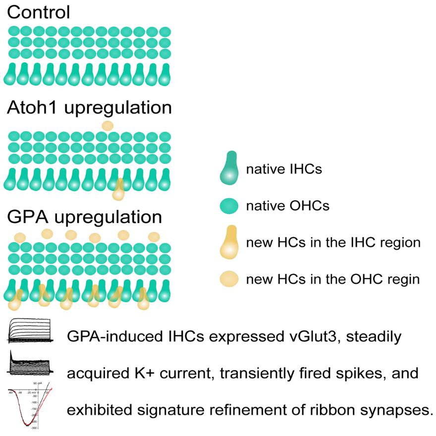 此前的研究表明,转录因子Atoh1是毛细胞发育分化调控的关键因子,在耳蜗支持细胞中上调Atoh1表达水平能够促进支持细胞向毛细胞的转化,但新生毛细胞呈现出幼稚毛细胞的特征,并且不能长期存活。要想达到听力修复,耳蜗新生毛细胞必须终末分化为内毛细胞和外毛细胞并且功能成熟。为了实现毛细胞的功能性再生,复旦大学附属眼耳鼻喉科医院研究团队筛选了内耳发育过程中对毛细胞成熟有关键作用的基因,发现Gfi1和Pou4f3基因对毛细胞的成熟和存活非常重要,提出科学假设:联合调控Gfi1、Pou4f3能够增强Atoh1诱导毛细胞分化的效率和促使新生毛细胞走向成熟。团队构建了同时高表达Atoh1、Pou4f3和Gfi1(简称GPA)的转基因小鼠,结合Fgrf3iCreER和Lgr5iCreER 转基因小鼠品系,使用Cre-loxp系统诱导GPA在不同的支持细胞中高表达。研究发现与单上调Atoh1组相比,GPA组的新生毛细胞的数量大幅度显著增加,说明Gfi1和Pou4f3共表达提高了Atoh1诱导支持细胞转分化的效率。GPA诱导产生的新生毛细胞能够表达耳蜗内毛细胞标志物vGlut3和外毛细胞标志物Prestin,提示GPA诱导的新生毛细胞更加成熟。进一步,团队发现新生毛细胞的机械电转导通道功能正常,并具有纤毛和神经突触。接下来,团队用膜片钳记录分析新生毛细胞的电生理学特征,发现新生内毛细胞和固有内毛细胞在发育过程中的电生理特征非常相似,新生毛细胞的钾通道、钙通道都具有功能,能够释放突触囊泡,提示GPA过表达促进了新生毛细胞的突触发育和功能成熟。