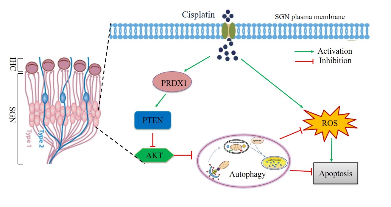 螺旋神经节神经元(spiral ganglion neuron, SGN)是听觉系统的初级传入神经元,它将由毛细胞传来的声音信息传递到脑干的耳蜗核产生听觉。广谱抗癌药物顺铂具有耳毒性,可损害SGN导致感音神经性听力损失,目前尚无预防和治疗方法。在听觉系统中,自噬被证明对耳蜗的发育和听力维护发挥重要作用,特别是在SGN发育中起关键作用。然而,关于自噬在顺铂诱导的SGN损伤中的作用及其潜在分子调控机制尚不清楚。