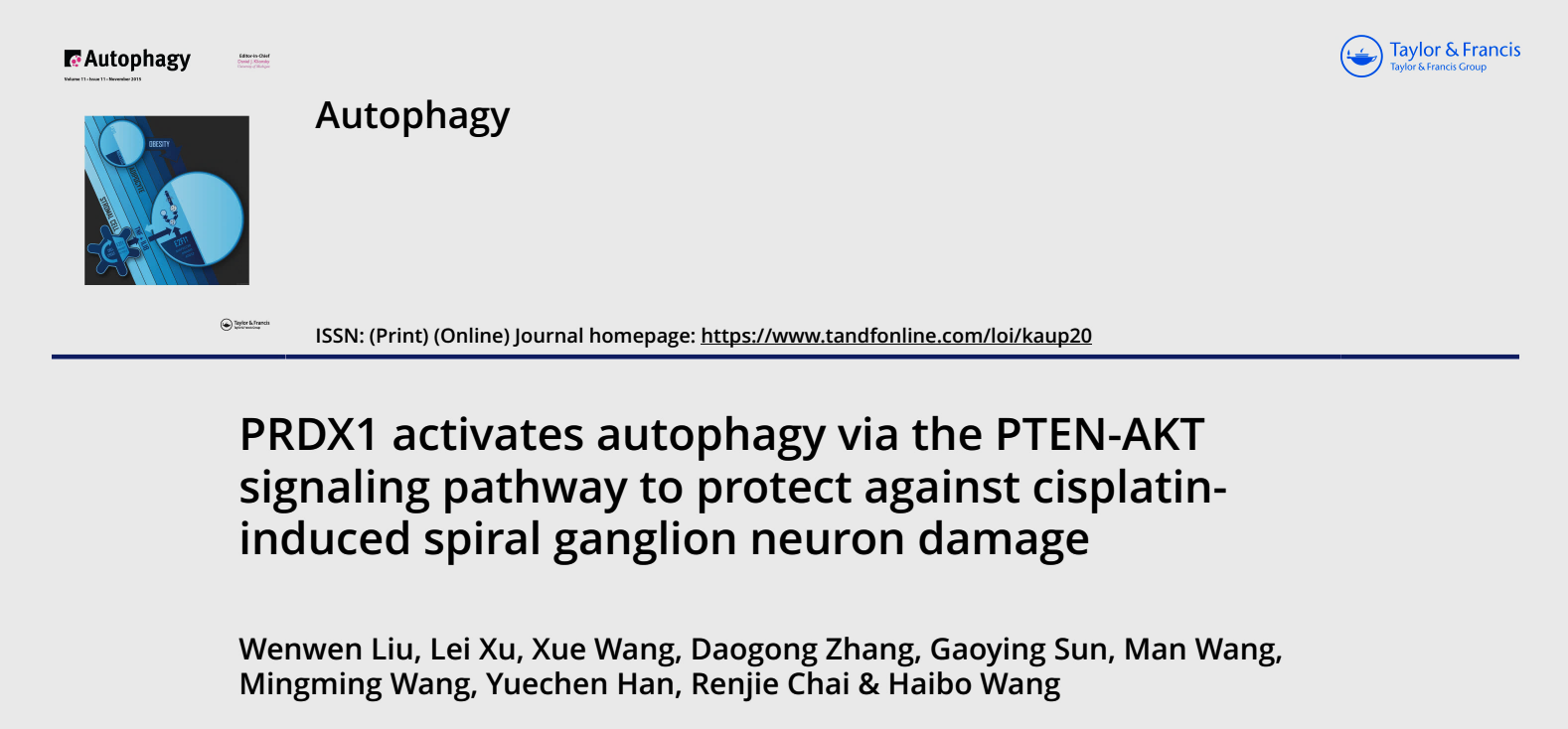 2021年4月12日,山东大学附属山东省耳鼻喉医院王海波教授、韩月臣教授与太阳成集团柴人杰教授合作在Autophagy上发表文章“PRDX1 activates autophagy via the PTEN-AKT signaling pathway to protect against cisplatin-induced spiral ganglion neuron damage”,该研究揭示了自噬对于顺铂造成的SGN损伤的保护作用,进一步阐明了PRDX1/PTEN/AKT级联信号通路对SGN自噬调控的分子机制。