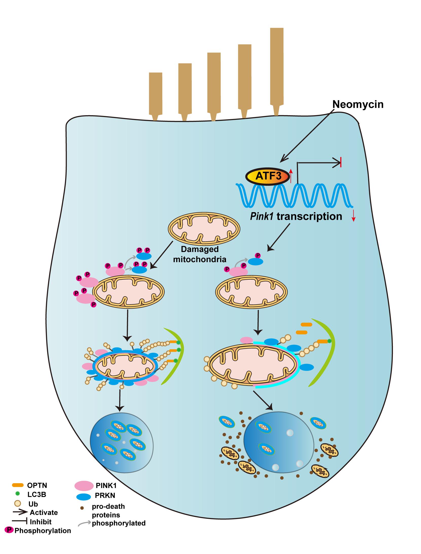 感音神经性耳聋是最常见的感觉障碍之一,内耳毛细胞不可逆损伤是造成感音神经性耳聋的主要原因之一。氨基糖苷类药物(如新霉素、卡那霉素)会损伤耳蜗毛细胞,但是其造成耳蜗毛细胞损伤的分子机制仍未完全阐明。已有研究表明氨基糖苷类药物会造成毛细胞的线粒体损伤,损伤线粒体及过度的活性氧积累是造成耳蜗毛细胞不可逆死亡的重要因素。线粒体通过自噬的方式清除受损伤线粒体的行为被称为线粒体自噬(mitophagy),氨基糖苷类药物损伤毛细胞线粒体后,损伤线粒体的清除(线粒体自噬)情况是否受影响以及具体机制仍然有待研究。因此,团队人员研究了经典线粒体自噬方式——PINK1/PRKN介导的线粒体自噬在新霉素引起的毛细胞损伤中的作用。在听觉类毛细胞系HEI-OC1细胞及离体培养的耳蜗中,研究人员发现新霉素抑制了PINK/PRKN介导的线粒体自噬。团队成员进一步的实验发现,新霉素通过促进转录调控因子ATF3的表达抑制线粒体自噬起始因子PINK1的转录活性进而抑制线粒体自噬的发生。同时,体外及体内实验证实了激活线粒体自噬,能够保护氨基糖苷类药物引起的毛细胞死亡,突触损伤及听力损失。
