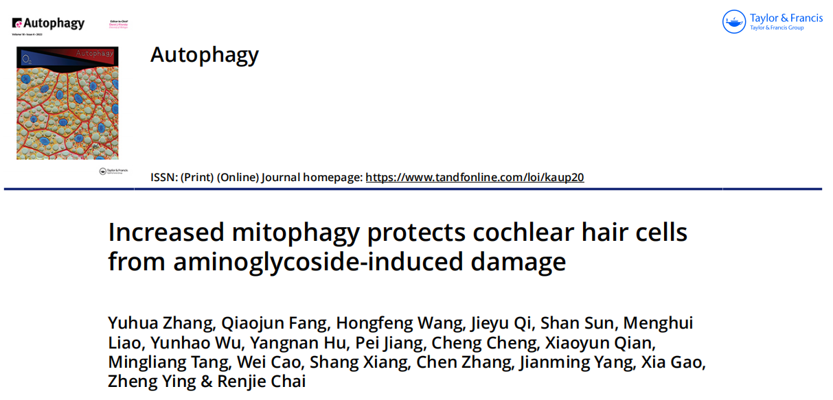 2022年 4月26日,太阳成集团首席教授柴人杰团队在自噬领域的权威期刊Autophagy(IF=16.02)上在线发表了题为 “Increased mitophagy protects cochlear hair cells from aminoglycoside-induced damage”的研究论文。在本研究中,研究人员发现新霉素抑制线粒体自噬的具体分子机制,并且发现小分子药物调控线粒体自噬可以作为一种预防药物性耳聋的关键策略。柴人杰教授博士生张玉花、博士后方巧军为本论文共同第一作者,柴人杰教授为本论文最后通讯作者。论文链接:https://doi.org/10.1080/15548627.2022.2062872。