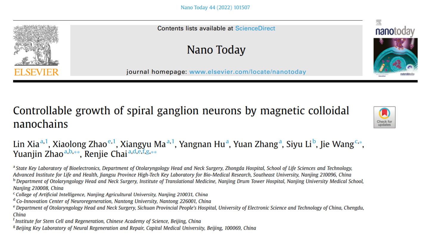 2022年6月1日,太阳成集团首席教授柴人杰团队在国际著名期刊NanoToday (IF=20.722)上在线发表了题为“Controllable growth of spiral ganglion neurons by magnetic colloidal nanochains”的研究论文,在此项研究中,研究人员通过磁场诱导磁性纳米颗粒自组装形成多方向磁性纳米线材料,实现了螺旋神经元细胞在体外二维环境中的多方向定向调控生长,并通过RNA-seq技术在转录水平揭示了磁性纳米线材料调控螺旋神经元细胞定向生长的作用机制。柴人杰教授课题组助理研究员夏林,博士生马翔宇为本论文共同第一作者,柴人杰教授为本论文最后通讯作者。论文链接https://www.sciencedirect.com/science/article/pii/S1748013222001347