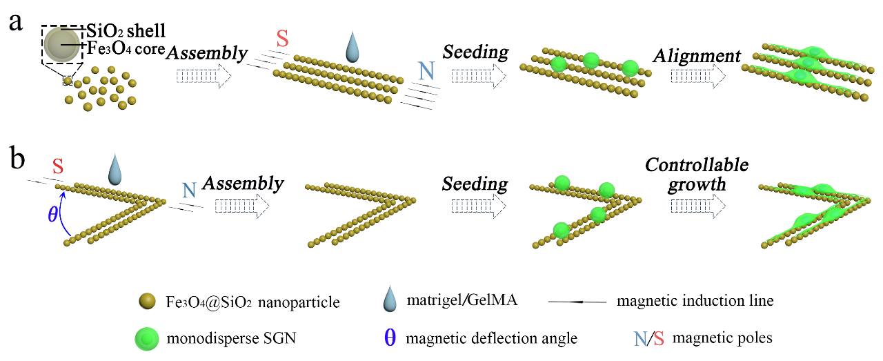 基于干细胞的神经通路再生修复已成为治疗感音神经性聋等神经退行性疾病的重要方法,目前,多种生物材料已被开发并应用于调控新生神经元细胞的定向生长。然而,目前所应用的生物材料通常只能够对新生神经元细胞进行单方向定向调控生长,并不适合神经通路蜿蜒复杂的结构,并且其潜在的调控机制尚未明确。因此,柴人杰教授团队基于磁性纳米颗粒在磁场诱导下的自组装行为设计出具有多方向特征的磁性纳米线材料,并实现螺旋神经元细胞在体外二维环境中的多方向定向调控生长。同时,柴人杰教授团队通过RNA-seq技术在转录水平揭示了磁性纳米线材料调控螺旋神经元细胞定向生长的作用机制。此项成果对于通过调控新生神经元细胞定向生长修复神经通路,从而治疗神经退行性疾病具有重要意义。