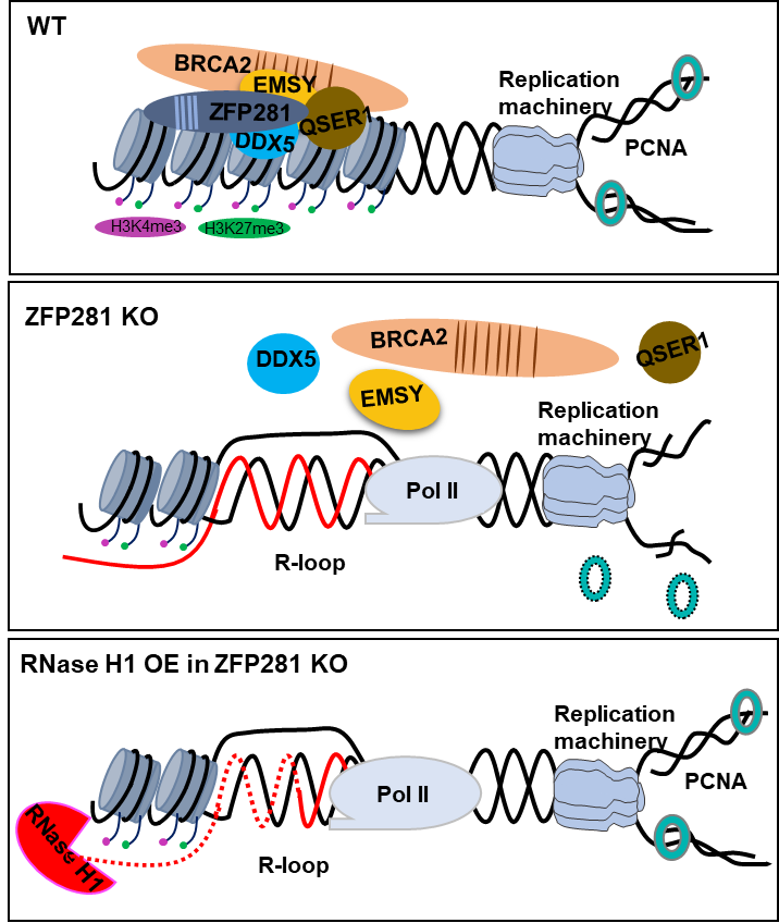 ZFP281是参与多种细胞生物进程的转录调控因子。林承棋教授和罗卓娟教授团队长期关注ZFP281在胚胎干细胞中的功能调控。在前期研究中,团队发现ZFP281 可募集SEC-like 3 亚基 AFF3 到增强子上调控印记基因的等位基因特异性表达(Nucleic Acids Res. 2017a); ZFP281 协同MLL2调控转座子区的组蛋白修饰及染色质局部结构,从而调控干细胞的命运决定及重编程(Nucleic Acids Res. 2017b); ZFP281募集MYC至基因启动子区促进转录延伸(Mol Cell Biol. 2019)。在这些前期研究基础上,本研究中,作者发现在胚胎干细胞中ZFP281基因敲除导致DNA复制缺陷和早期S期延迟,从而造成细胞增殖缺陷。分析表明,ZFP281缺失降低染色质上PCNA水平,进而引发DNA复制缺陷。在分子机制上,作者鉴定到BRCA2是一个新的ZFP281互作蛋白。进一步机制研究表明,ZFP281与PRC2募集并稳定BRCA2在二价染色质区域的结合。ZFP281或BRCA2缺失会导致二价染色质区域R-loop的异常积累,导致胚胎干细胞中发育相关基因的表达异常(模式图如下)。