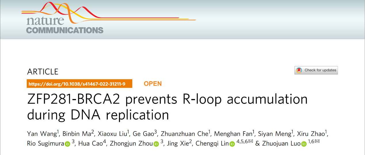 2022年6月17日太阳集团tcy8722林承棋教授和罗卓娟教授团队在国际著名期刊Nature Communications发表了题为ZFP281-BRCA2 prevents R-loop accumulation during DNA replication的研究论文,报导了ZFP281与BRCA2互作阻碍R-loop异常积累,维持胚胎干细胞DNA复制的正常进程。