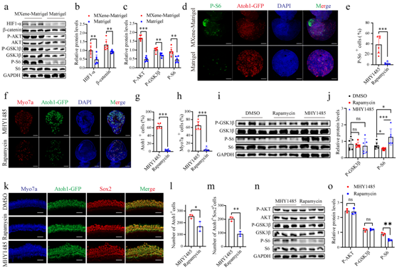 本研究中,利用Ti3C2TxMXene调节了Matrigel水凝胶的理化特征,表现出优异的生物相容性。研究发现MXene-Matrigel复合水凝胶能够调节耳蜗类器官(Cochlea-Orgs)的生长,尤其是促进耳蜗类器官毛细胞的再生和成熟。与Matrigel中的毛细胞相比,MXene-Matrigel中再生的毛细胞表现出更好的电生理特性,一些特征不亚于体内原位毛细胞。研究人员进一步阐明了MXene-Matrigel通过激活mTOR信号通路以促进毛细胞的再生,而抑制mTOR信号通路会抑制毛细胞的分化。此外,本研究还开发了耳蜗类器官和蜗轴神经元的共培养体系,并应用MXene-Matrigel促进了再生毛细胞与螺旋神经节神经元(SGNs)建立神经支配,以及提高突触的形成效率。本研究克服了传统类器官培养系统的一些局限性,促进了耳蜗类器官发育、成熟和毛细胞体外再生方面的研究。