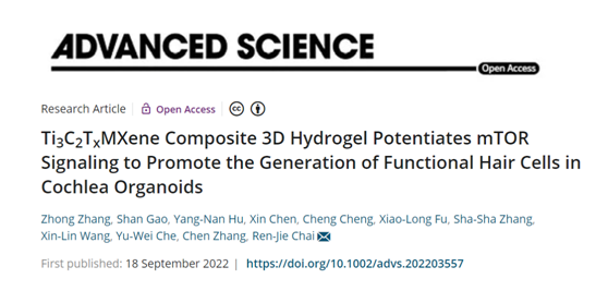2022年9月18日,东南大学首席教授柴人杰团队在国际著名期刊Advanced Science (IF=17.521)上在线发表了题为“Ti3C2TxMXene Composite 3D Hydrogel Potentiates mTOR signaling to Promote the Generation of Functional Hair Cells in Cochlea Organoids”的研究论文。在本研究中,研究人员发现了促进耳蜗类器官(Cochlea-Orgs)毛细胞再生的新方法,并阐明了MXene促进功能性毛细胞再生的新机制。柴人杰教授为本论文唯一通讯作者。柴人杰教授课题组博士生张重为该论文的第一作者,博士生高珊和胡杨楠为该论文的共同第一作者。论文链接:https://doi.org/10.1002/advs.202203557。