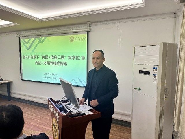 外语公司副经理胡永辉教授作为特邀嘉宾,就英语+信息工程双学位项目申报与建设进展作了经验分享,胡永辉教授系统介绍了项目背景、建设基础、建设方案、运行管理等方面,指出要不断思考如何把服务国家重大战略,服务产业重大需求,服务社会重大关切融入到人才培养的改革中,顺应新时代科技发展趋势,发展新的新兴专业,吸引优质生源,培养领军人才。