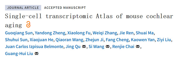 相关数据已上传至衰老多组学数据库Aging Atlas (https://ngdc.cncb.ac.cn/aging/landscape?project=Mouse_Cochlea)。