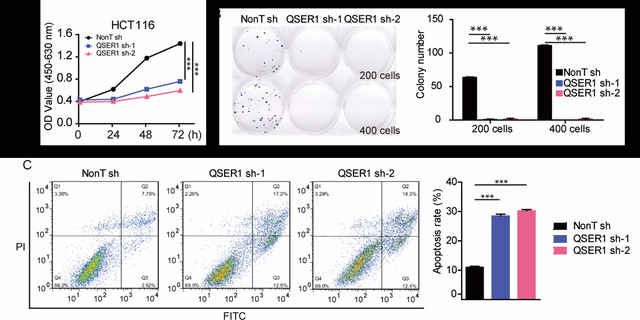 在前期研究中,团队发现QSER1可以和BRCA2,ZFP281,EMSY 形成复合物,结合在基因组上阻碍R-loop异常积累,维持胚胎干细胞DNA复制的正常进程 (Nature communication. 2022)。本研究聚焦于QSER1在癌症中的表达和功能调控。通过临床数据分析显示,QSER1在多种肿瘤组织中高表达,且高水平的QSER1表达与不良的临床预后存在正相关性。进一步的功能研究发现,肿瘤细胞中QSER1的敲低显著促进了细胞凋亡(图1)。