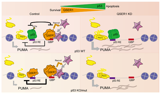 综上所述,文章揭示了QSER1是一种具有普遍效应的抗凋亡因子,在p53存在或者突变/缺失中,都可以通过抑制促凋亡基因转录并维持其低表达水平,进而抑制细胞凋亡(图2.作用模式图)。提示靶向QSER1可能作为诱导多种癌症,特别是p53突变癌症细胞凋亡的普遍策略。