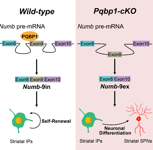 Renpenning综合征是一类X染色体连锁的智力发育迟滞疾病,由多聚谷氨酰胺结合蛋白1(Ployglutamine-binding protein 1,PQBP1)基因突变所导致。Renpenning综合征患者表现出小颅畸形症状,暗示PQBP1基因突变会导致大脑发育异常,但其中的调控机制尚不完全清楚。大脑发育主要分为背侧端脑发育和腹侧端脑发育。此项研究主要以纹状体发育为例,探究PQBP1在腹侧端脑发育过程中的作用及其机制。研究发现纹状体前体细胞中敲除PQBP1导致纹状体前体细胞增殖下降,分化增加,进而引起纹状体发育缺陷。RNA深度测序结果揭示PQBP1通过促进Numb pre-mRNA的9号外显子保留,进而促进纹状体前体细胞的自我增殖。当在纹状体前体细胞中敲除Pqbp1,则促进Numb pre-mRNA的9号外显子去除,进而抑制纹状体前体细胞增殖,增加分化。该研究工作详细探究了X染色体连锁的智力障碍相关因子PQBP1调控纹状体发育的机制,为阐明Renpenning综合征的致病机理提供新的理论基础。