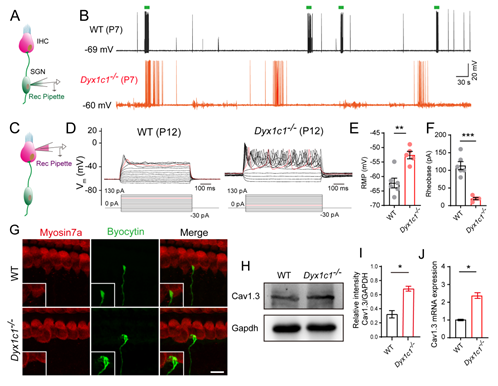 耳蜗中的听觉毛细胞(hair cells)和螺旋神经元(spiral ganglion neurons)对于声音信号的转导和传输至关重要。毛细胞将外界声音的机械能信号转换为电信号,通过突触结构将声音信号传递至螺旋神经元,随后经过多级听觉核团最终到达听觉中枢后对这些声音信号进行分析处理,由此产生听觉。在这项研究中,该团队利用Dyx1c1基因敲除小鼠来模拟阅读障碍相关的病理表型,通过ABR和DPOAE测听技术发现该敲除小鼠患有严重的听力损失。首先,该团队发现敲除Dyx1c1基因后导致耳蜗毛细胞的动纤毛结构以及纤毛束的平面细胞极性的改变。随后,该团队进一步利用膜片钳技术发现当敲除Dyx1c1后耳蜗内螺旋神经元的早期自发电活动模式被破坏,听觉神经通路成熟度降低,声音信号无法通过螺旋神经元传递到听觉中枢,由此导致耳聋。