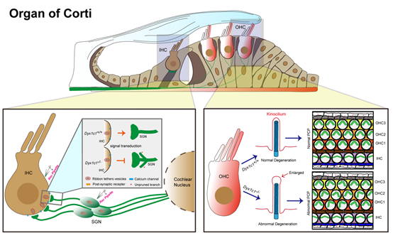 图2:Dyx1c1基因缺失导致耳蜗毛细胞和螺旋神经元异常的示意图
