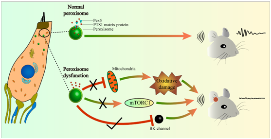图1 :在耳蜗毛细胞中过氧化物酶体缺陷导致听力损失示意图