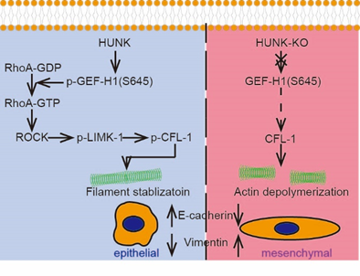 图1:HUNK/GEF-H1轴抑制CRC的EMT模式图