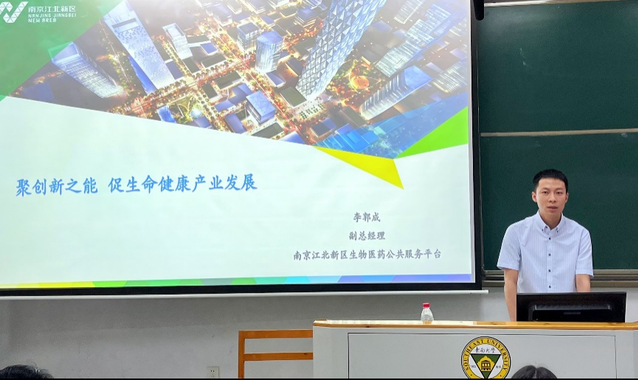 南京江北新区生物医药公共服务平台的李郭成副总经理给同学们带来了以《聚创新之能促生命健康产业发展》为题的主题讲座。李老师结合全球新药研发热点与趋势以及国内新药研发情况与所面临的困境,提出了目前医药产业需求与CRO服务方向,新药创制是关键与难点。为了让同学们更清晰地了解到生命健康产业情况,以南京江北新区为例,着重介绍了“3+3+X”的产业战略定位以及“一基地一谷一区一中心”的生命健康产业规划布局。最后,李老师也鼓励同学们可以考虑创业,在南京江北新区生物医药公共服务平台实现自己的科研理想。