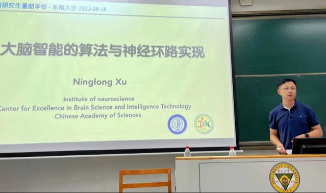 中国科公司神经科学研究所高级研究员徐宁龙以《大脑智能的算法与神经环路实现》为主题。徐宁龙研究员以图例形式生动形象的展示了大脑从感知到决策的智能算法的改变,谈及自己实验室相关研究进展:利用神经环路光学记录和光学操控技术,结合动物行为学范式,发现来自眶额叶的反馈信息支持听皮层对听觉分类标准的编码,这种神经环路运算符合基于任务状态推断的强化学习计算模型,可实现基于任务规则的灵活信息分类。最后,徐宁龙研究员介绍了如何在单神经元水平上完成整合任务规则与感知输入从而做出抉择的机制研究。总的来说,本次讲座内容丰富、深入、让同学们对于基于知识的灵活认知行为的神经环路运算原理有了初步认知。