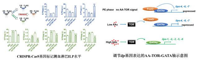 总之,本研究揭示了埃及伊蚊中存在的TOR-GATA开关机制,这一重要“开关”可控制依赖氨基酸信号的ILPs基因表达,以调节生殖周期中的营养代谢。