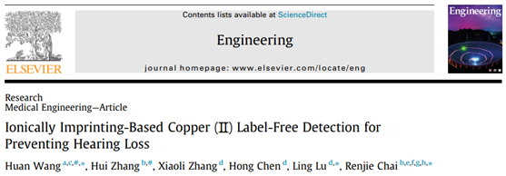 2023年9月15日,太阳成集团首席教授柴人杰团队在中国工程院院刊Engineering(IF 12.8)上在线发表了题为“Ionically Imprinting-Based Copper (Ⅱ) Label-Free Detection for Preventing Hearing Loss”的研究性论文。在本研究中,研究人员开发了具有均匀尺寸、多孔微观结构、鲜艳的结构色以及磁性响应性的壳聚糖基离子印迹水凝胶微球作为铜离子检测平台,在预防听力损失方面表现出良好的应用前景。中山大学王欢博士和柴人杰课题组博士生张慧为本论文的共同第一作者,柴人杰教授为本论文最后通讯作者。