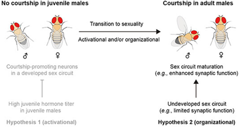 新生动物性能力的形成一般需要一定的性成熟时间而并不是与生俱来的,性行为的产生与神经环路的组织重构和生殖竞争中的适应性优化有关。性能力的获得一直有两种假说:一种是性成熟过程涉及组织结构上的神经环路的发育(组织性假说);另一种是对已形成的神经环路功能性的激活或抑制的解除(激活性假说)。关于哺乳动物的研究大都支持组织性假说,而最近对于果蝇的一项研究认为性环路在年幼雄蝇中已经发育完全,但保幼激素暂时抑制了性环路的功能从而导致年幼果蝇不表现出性行为(图1左)。